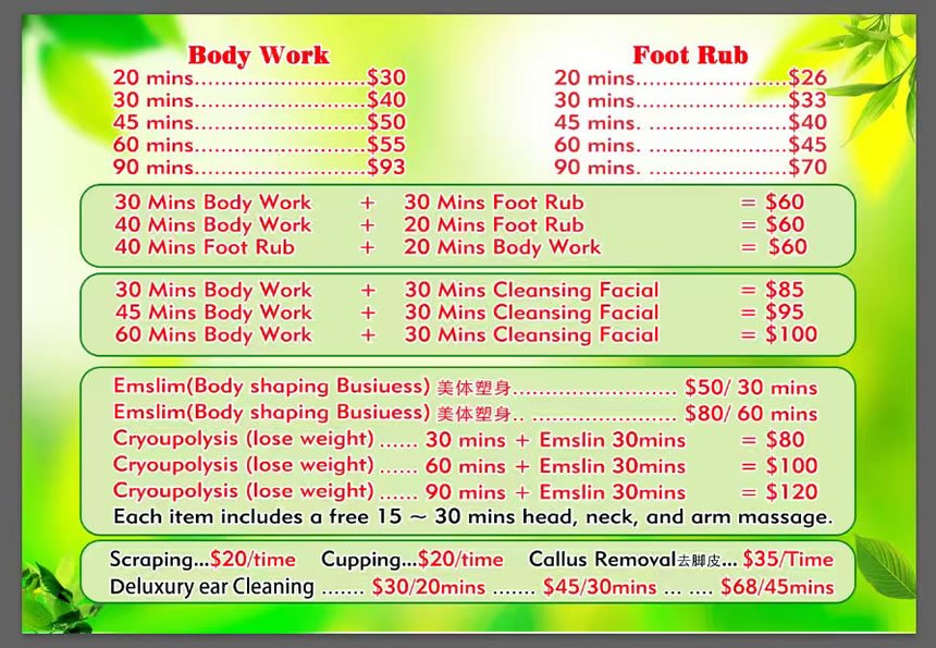 Currently, Kimberly Spa has two locations in Chinatown, NYC that offer professional body and foot massages (Reflexology). Our atmosphere is relaxing, so it is good for releasing stress. At Kimberly Spa, you can choose from 20 professional masseurs who are specialized in helping you to eliminate body fatigue and loosen up any tension around you legs, neck, and waist areas.